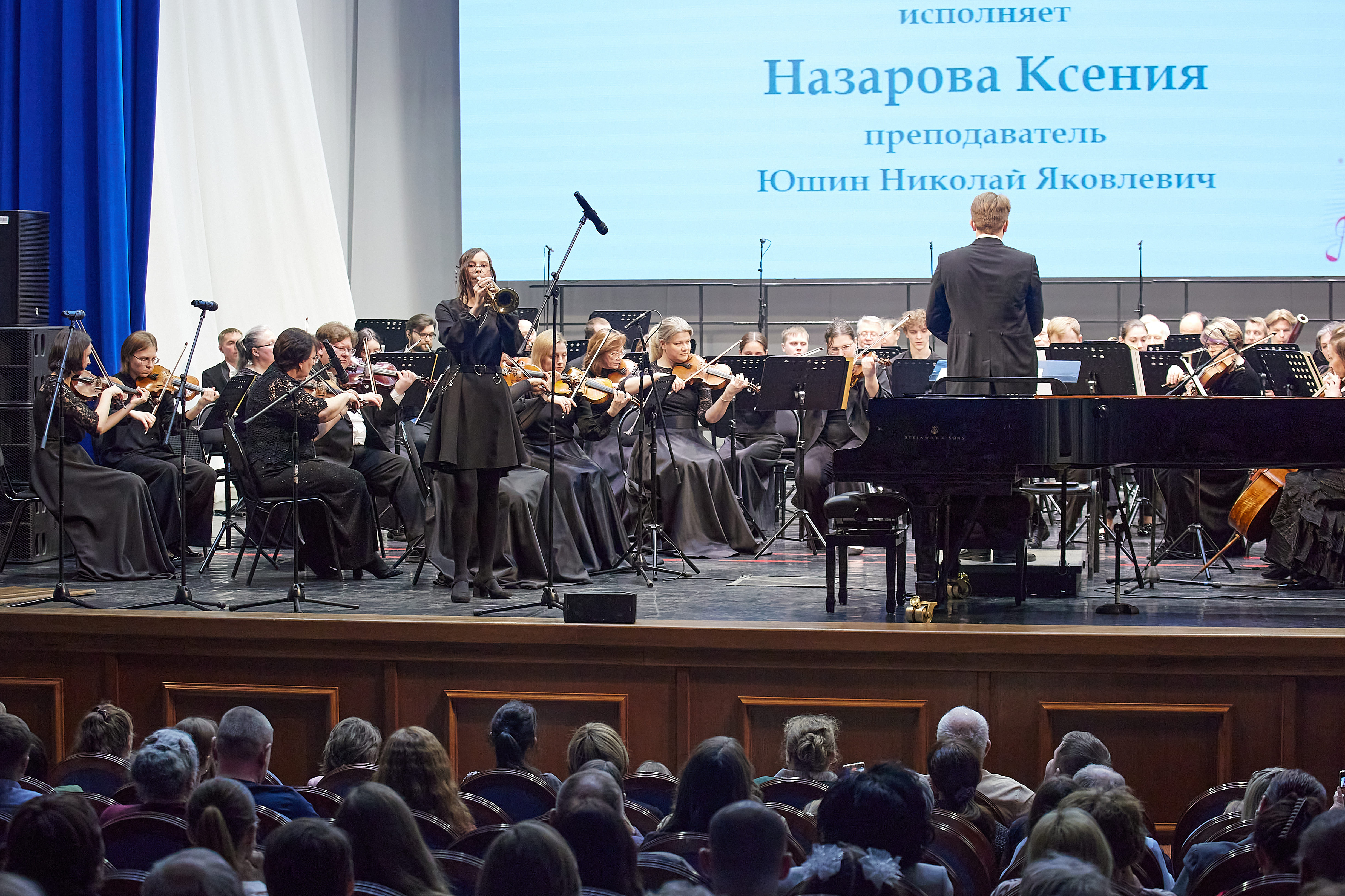 Спустя всего несколько дней, 14 апреля, состоялось ещё одно яркое событие – концерт с симфоническим оркестром филармонии Кузбасса «Симфония детства». На этот раз на сцену вышли другие талантливые воспитанники. Среди них у, ащиеся нашей школы Артем Нестеров, также ученик Алексея Евгеньевича Баталова, вновь покорил публику своим исполнением на ксилофоне, представив увертюру к опере Жоржа Бизе «Кармен». А Ксения Назарова, занимающаяся у преподавателя Николая Яковлевича Юшина, поразила слушателей своим мастерством игры на трубе, исполнив "Поэму" Дмитрия Гинецинского.