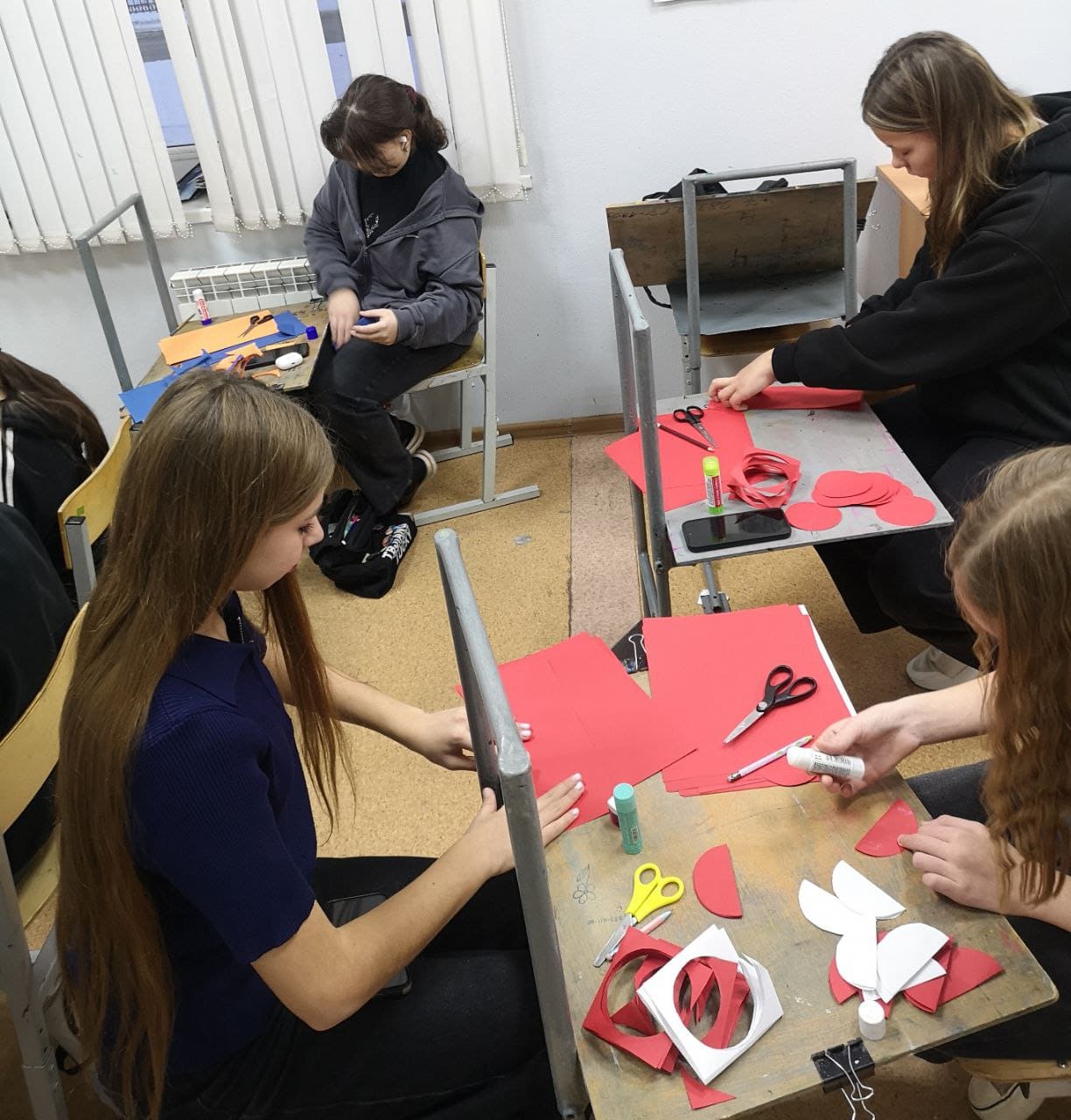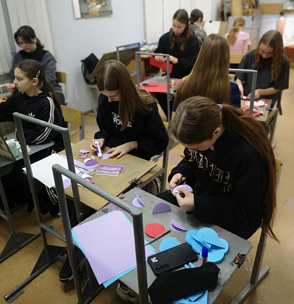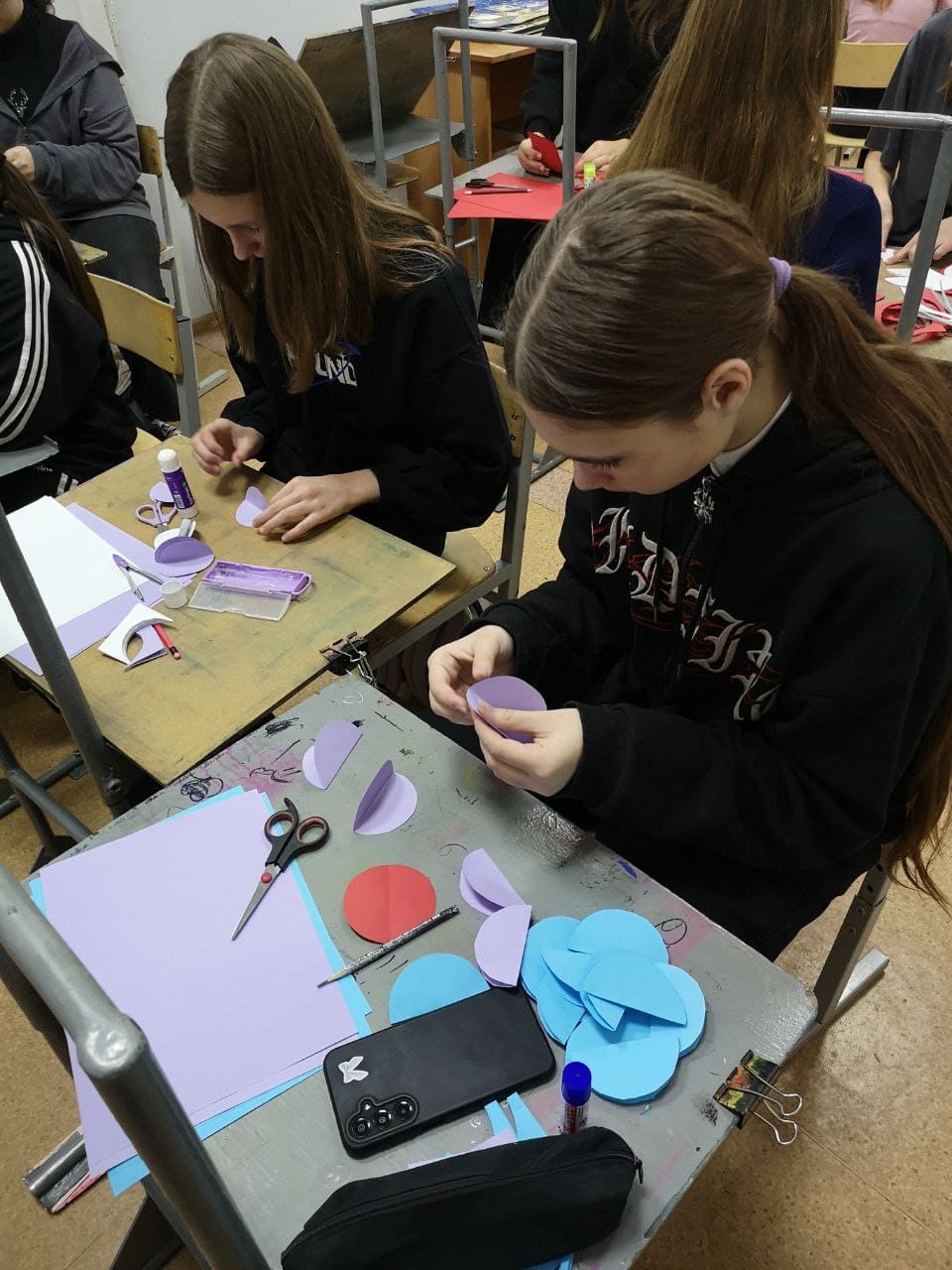 Учащиеся 3 класса в возрасте 11-12 лет выполнили поделки по шаблонам в определенной цветовой гамме на свое усмотрение - это шары, елочки, сосульки, луковки и звёзды.