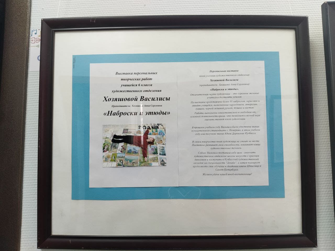 На выставке представлено более 60 набросков, зарисовок и этюдов учащейся, выполненные карандашом, акварелью, гуашью, черной гелиевой ручкой, тушью и кистью. Работы выполнены самостоятельно в свободное от основной деятельности время, что позволяет в полной мере оценить талант юной художницы.