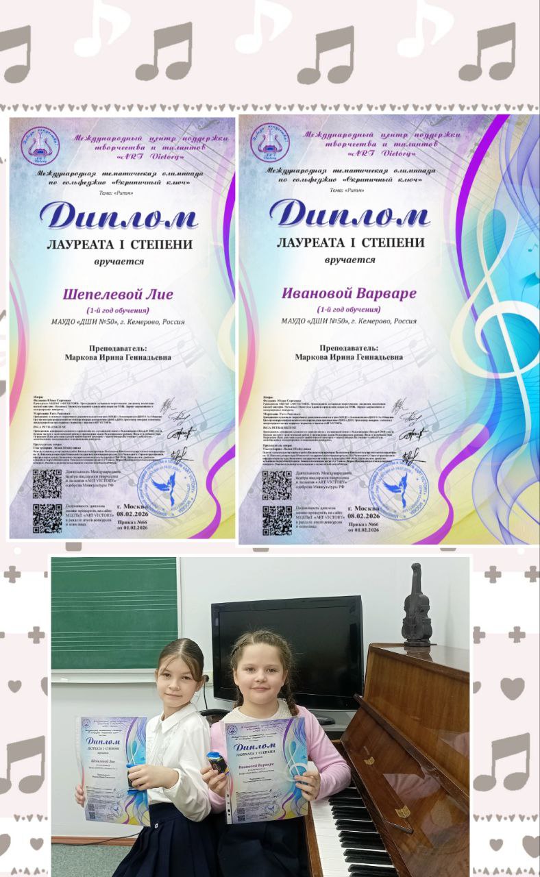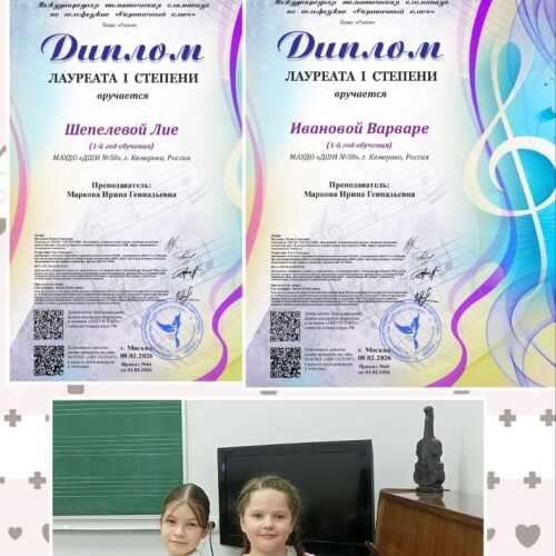 Поздравляем с победой в теоретической олимпиаде по сольфеджио учащихся 1 класса Шепелеву Лию, Иванову Варвару и их преподавателя Маркову Ирину Геннадьевну.
