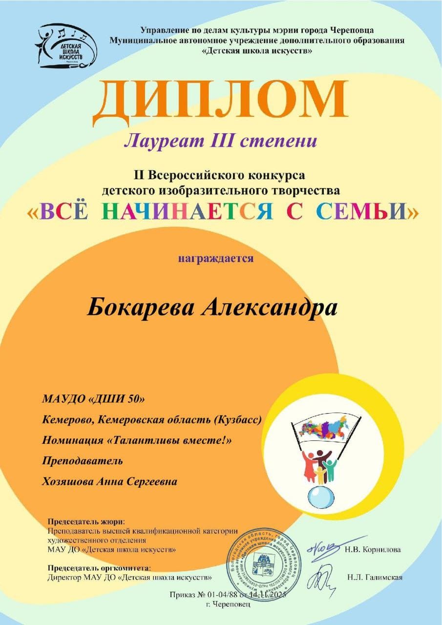 Лауреат 3 степени - Бокарева Александра - преподаватель Хозяшова Анна Сергеевна