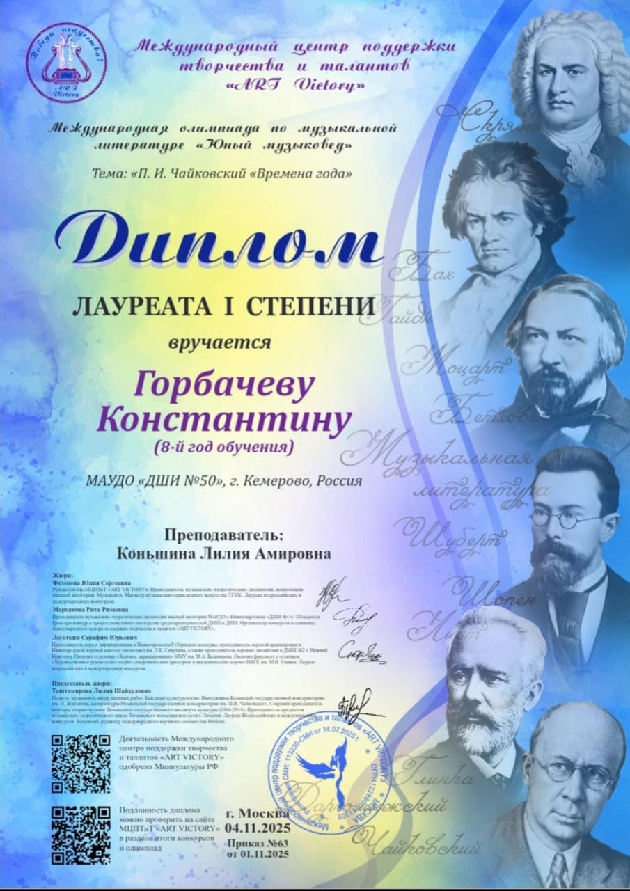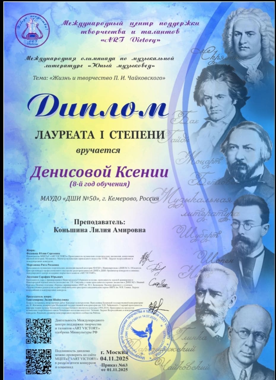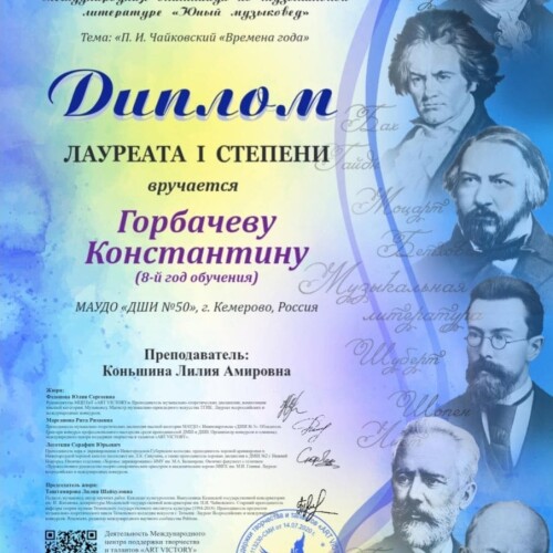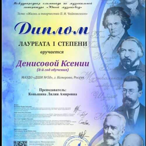 Денисову Ксению и Горбачева Константина (преп. Коньшина Л. А.) - лауреатов I степени Международной олимпиады по музыкальной литературе «Юный музыковед»