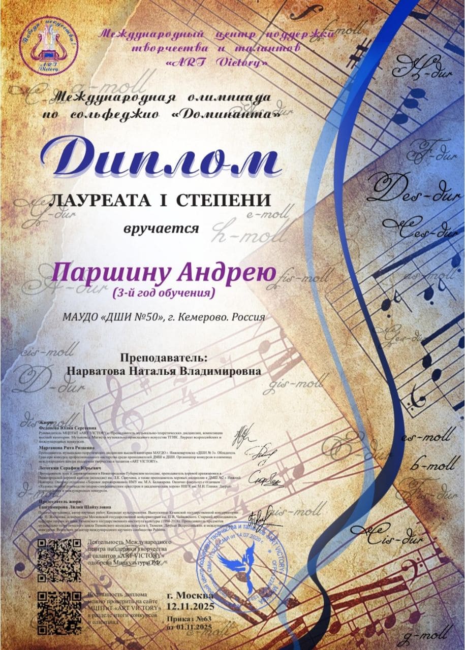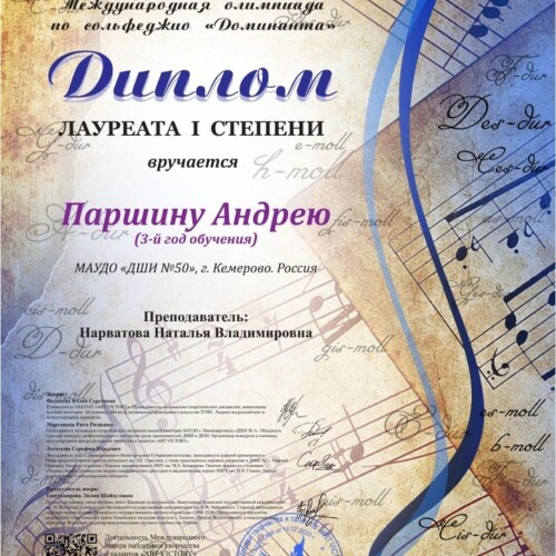 Паршина Андрея (преп. Нарватова Н.В.) - лауреата I степени Международной олимпиады по сольфеджио «Доминанта»