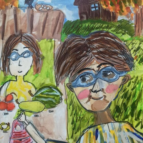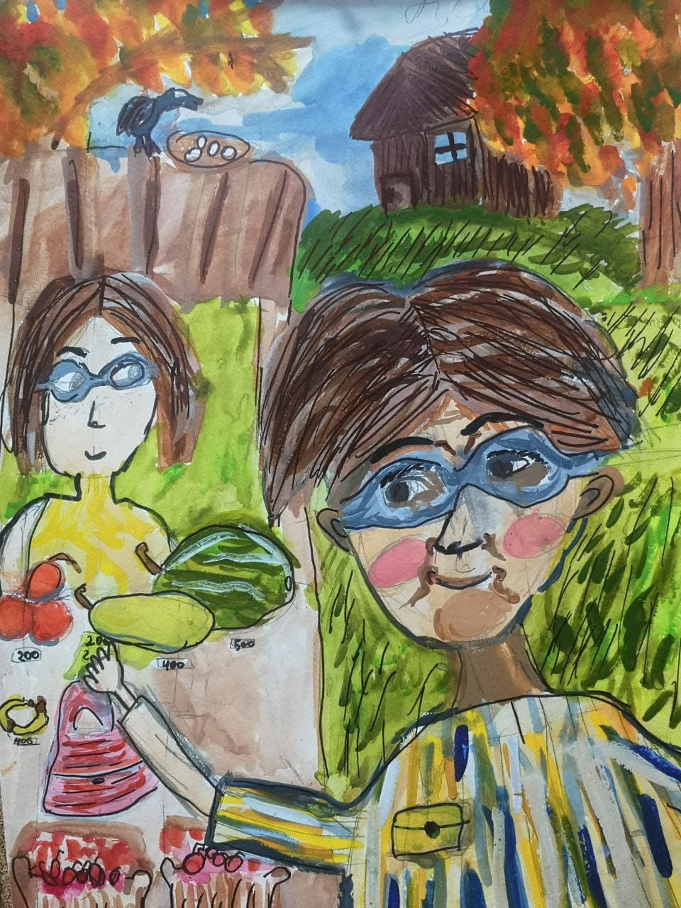В рисунках можно увидеть бабушку за вязанием или на рынке, как она покупает ягоды для своих любимых внуков, или как бабушка с дедушкой прогуливаются по городской набережной реки Томи, как хлопочет по хозяйству или сидит рядышком с дедушкой.