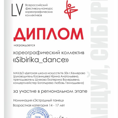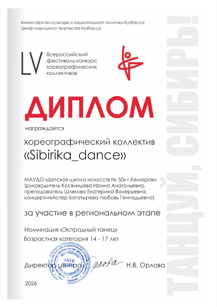 Сегодня, 14 февраля, хореографический коллектив Sibirika-Dance ДШИ №50 (рук. Косвинцева Ирина Анатольевна) принял участие в отборочном региональном этапе Всероссийского фестиваля конкурса хореографических коллективов «Танцуй, Сибирь». Номинация «Эстрадный танец, 14-17 лет». На конкурс было представлено два номера «Погоня за чувствами», «Преодолевая девятый вал».