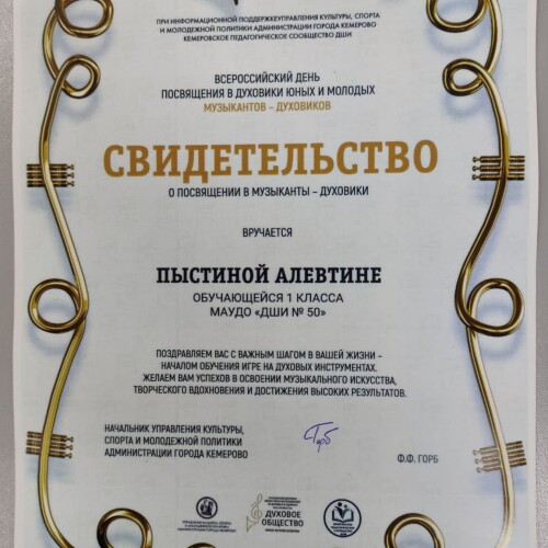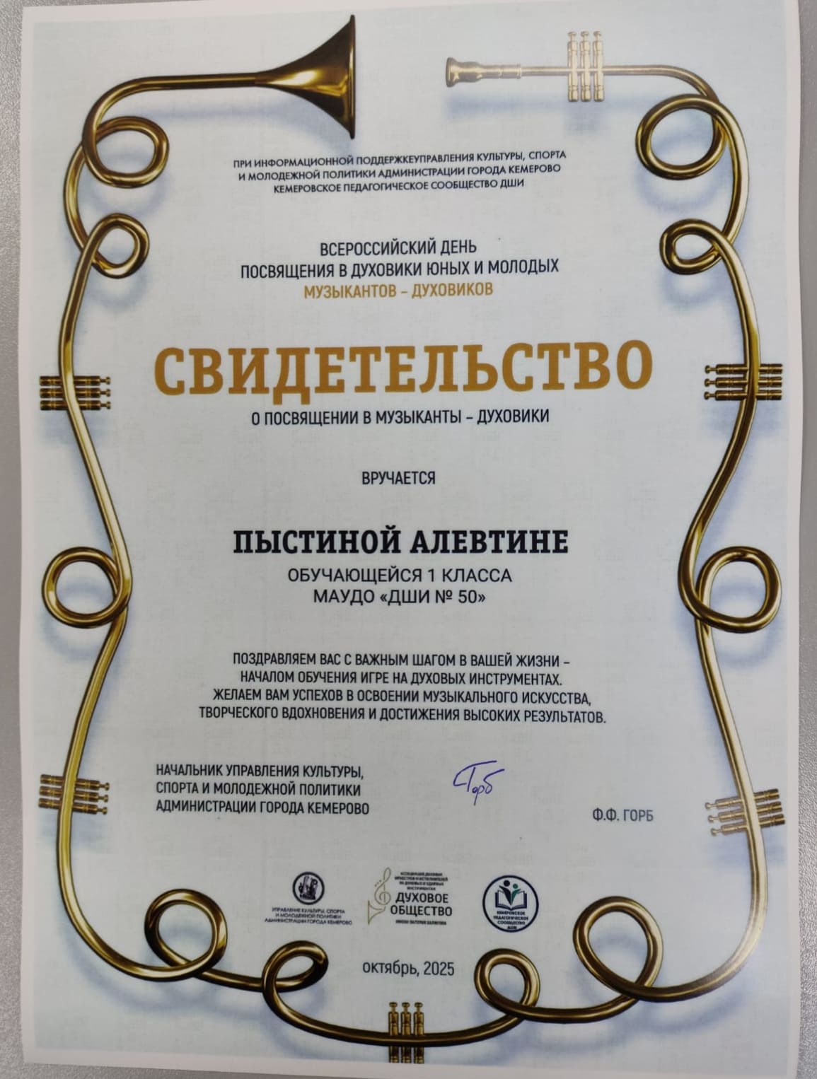 В рамках городского методического объединения 27 октября прошёл Всероссийский день посвящения в духовики, где юным первоклассникам духовых отделений школ искусств города торжественно вручили свидетельства и посвятили в музыканты.
