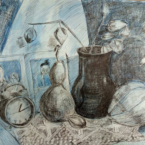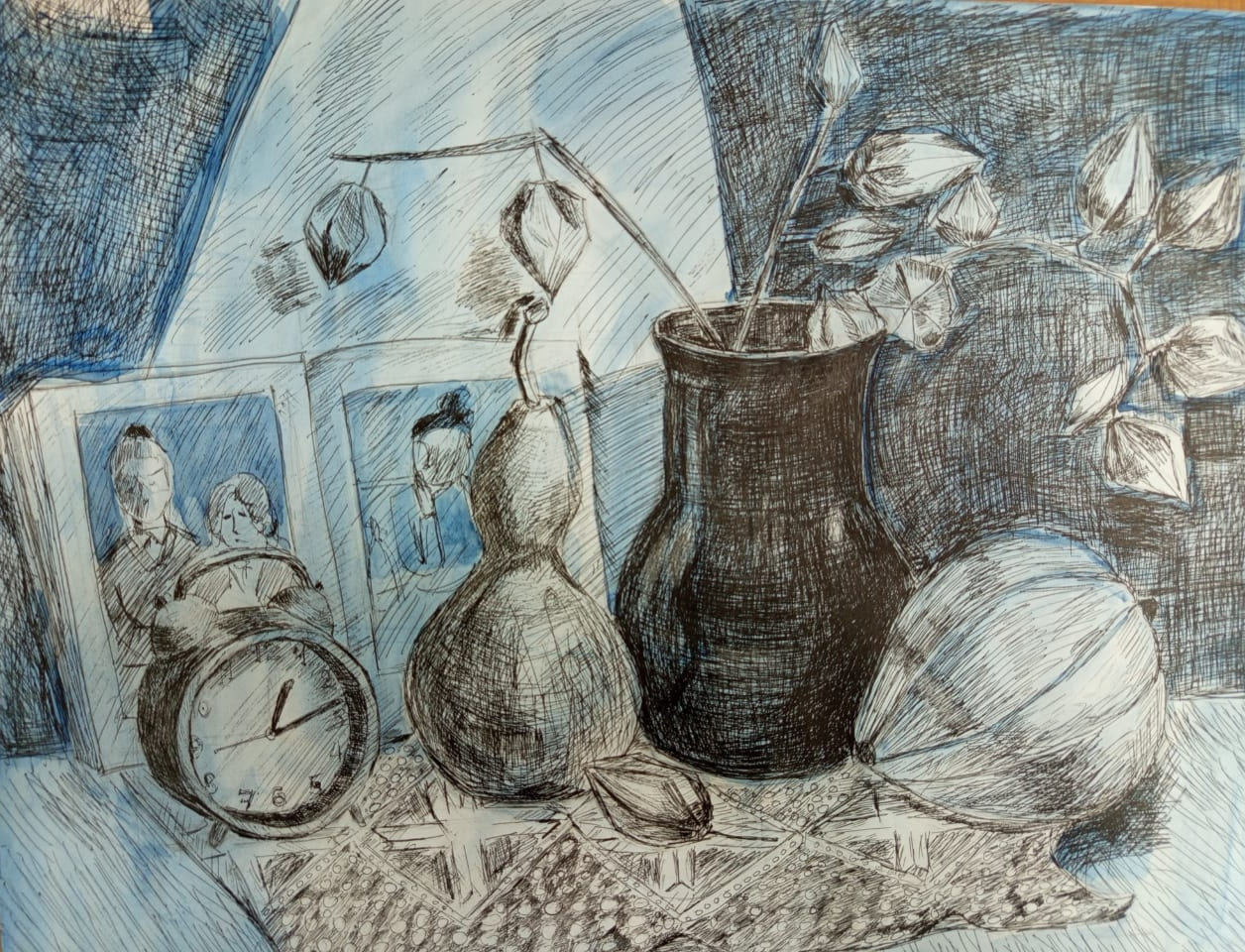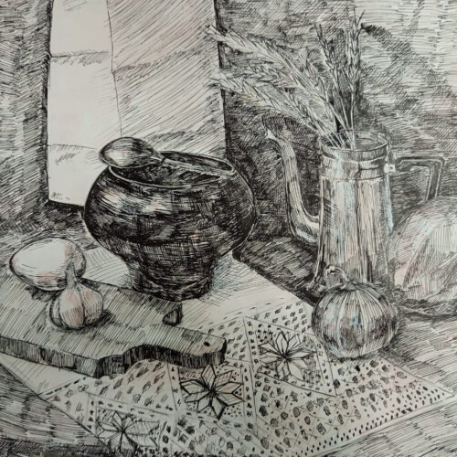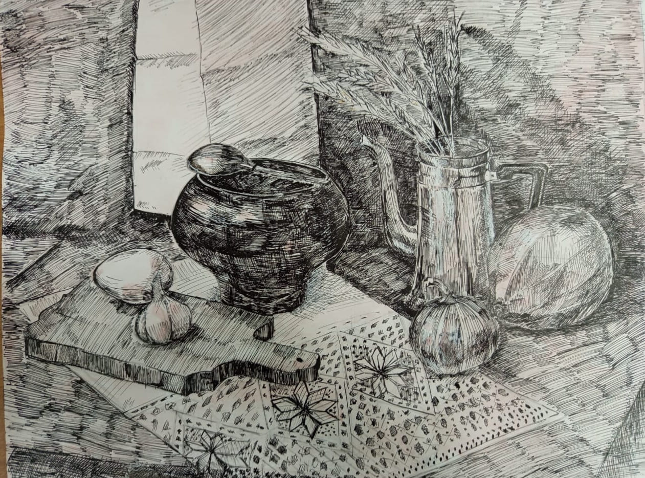 Юным художникам в основном 13, 14 лет. Работы различаются по сделанности и качеству, но каждый ученик рисовал и старался в меру своих способностей. От задания к заданию, шаг за шагом учащиеся закрепляют свои навыки и умения в работе над натюрмортом, осваивают разнообразные технические приёмы, материалы.